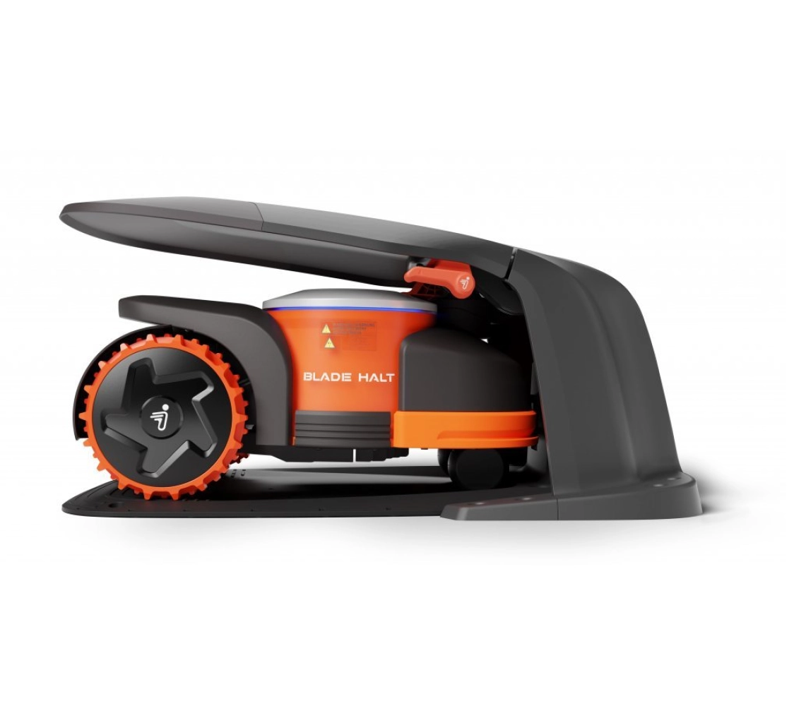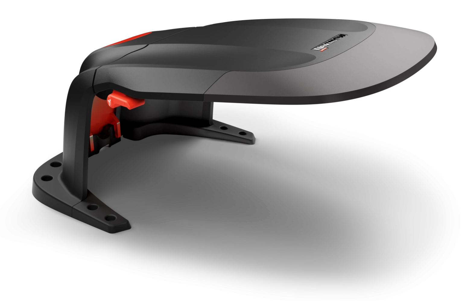 Le garage est fait de matériaux de haute qualité qui résistent aux rayons UV, à la pluie et à la neige. Son dessus articulé permet un accès facile au clavier et à l’écran pour configurer et contrôler la tondeuse. Un trou à l’arrière du garage permet un branchement facile des câbles.