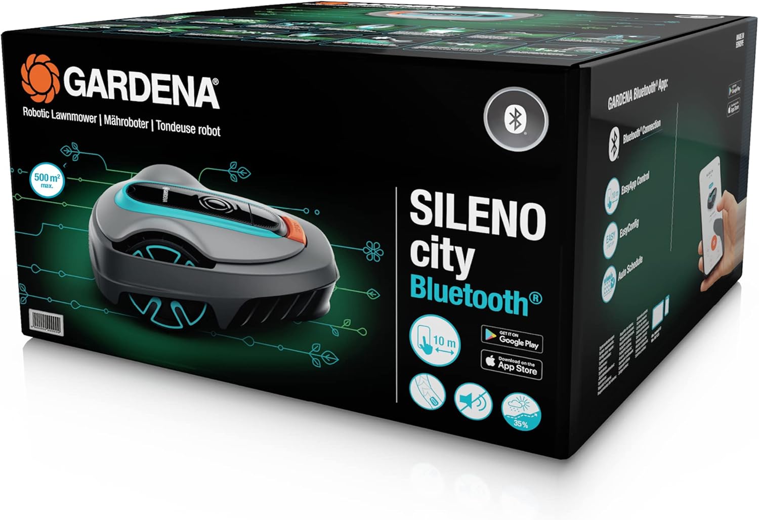 La GARDENA SILENO City 500 est dotée de nombreuses fonctionnalités pour offrir confort et efficacité. Elle comprend une station de charge, un départ programmable, une gestion des passages étroits, ainsi qu’une charge rapide de 60 minutes pour une tonte de la même durée. Son interface intuitive permet une programmation et une utilisation simplifiées. De plus, elle fonctionne très silencieusement, émettant seulement 58 dB, ce qui évite de déranger les voisins.
